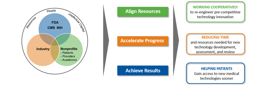 MDIC is the only public-private partnership (PPP) focused exclusively on the strategic needs of the medical device ecosystem. MDIC is designed to create a collaborative environment where the industry, nonprofit organizations, and government can work together to advance pre-competitive medical device research so that the medical device community can keep pace with the needs of patients in the United States in a more timely manner.