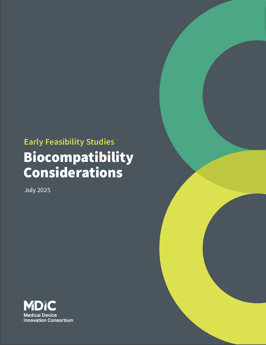 This resource, developed by MDIC’s EFS Biocompatibility Working Group, offers clear, risk-based biocompatibility assessment considerations to help medical device developers efficiently plan and conduct each stage of an EFS, including initiation, transition from EFS to pivotal study, device modifications during an Investigational Device Exemption, and transition from clinical study to marketing submission.