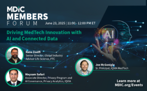 Join us for an MDIC Members Forum featuring insights from two MDIC member organizations, PTC and IQVIA. This session will explore how MedTech companies can harness AI and connected data to drive innovation, improve compliance, and enhance patient outcomes.